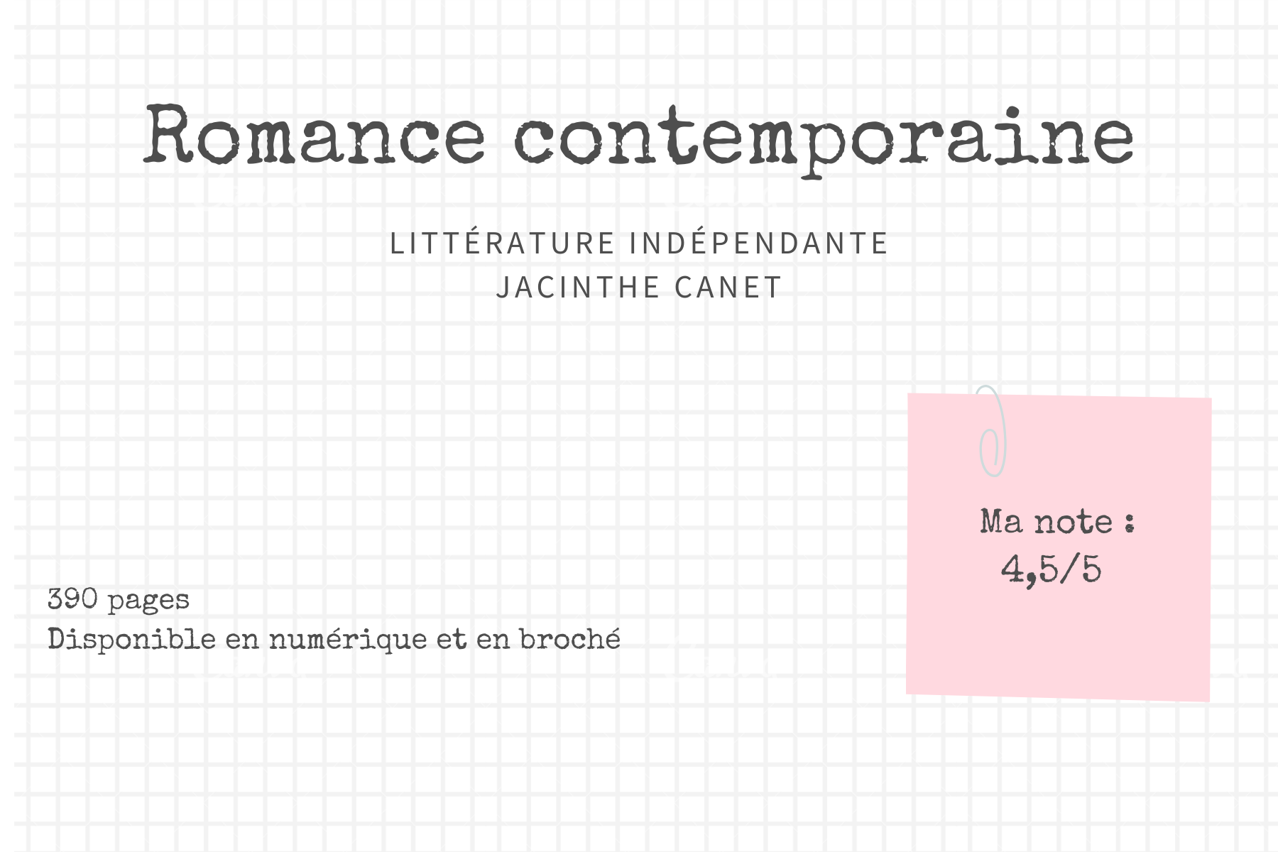 Jacinthe Canet a le don extraordinaire de faire vivre une aventure où les émotions s’intensifient jusqu’à leurs apogées et s’effondrent pour renaître. Elle adore jouer avec l’espace temporel et je ne peux que remarquer que c’est très agréable de ne pas rester figer sur un temps donné (trop court souvent). L’évolution des personnages n’en est que meilleure et très représentative. Cette romance est à la fois douce, imprévisible, tonitruante, douloureuse, passionnante et passionnelle, fulgurante, désarmante et terriblement captivante. Une nouvelle fois je suis tombée sous le charme de la plume de Jacinthe Canet et qu’est-ce que ça fait du bien de se laisser porter par une si belle histoire.